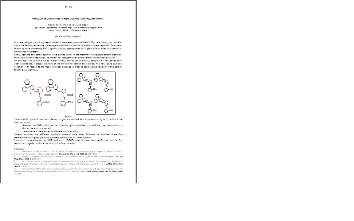 Our research group has long been involved in the development of new 5-HT1A selective ligands and 1,3-dioxolane derivatives bearing a phenoxyethylamine basic portion in position 4 were reported1. They were shown to have interesting 5-HT1A agonist activity accompanied by a good affinity, even if a certain alpha1 affinity was still present. 5-HT1A agonists and partial agonists have proved useful in the treatment of neuropsychiatric disorders such as anxiety and depression, to prevent neurodegeneration and for their antinociceptive activity2,3. On this basis and with the aim to improve 5-HT1A affinity and selectivity, compound A derivatives have been synthesized. A frozen structure of the ethylamine portion characterizes the new ligand and this variation4 with respect to the lead A has been designed in order to decrease the flexibility of this part of the molecule (figure 1). Stereospecific synthesis has been planned to give the desired four enantiomers (figure 1) so that it has been evaluated: 1. the effect on 5-HT1A affinity of the molecular rigidity provided by pyrrolidine core in comparison to that of the lead compound A; 2. stereoisomeric preferences for the receptor interaction. Several reactions and different synthetic schemes have been followed to obtained these four stereoisomers with good yield and a process optimization has been pursued. Structural characterization by NMR and mass (Q-TOF) analysis have been performed on the final compounds together with their optical purity determination.| File | Dimensione | Formato | |