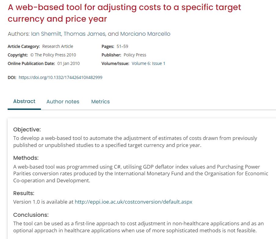 A web-based tool for adjusting costs to a specific target currency and price year / Shemilt, Ian; Thomas, James; Morciano, Marcello. - In: EVIDENCE & POLICY. - ISSN 1744-2648. - 6:1(2010), pp. 51-59. [10.1332/174426410x482999]